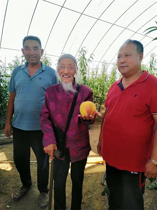 姜乃斌先生(右一)同张仁池老寿星(中)在果园合影
