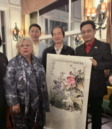 著名画家唐新江向电影节组委会赠送了国画《富贵平安图》,作品以中法两国国花牡丹、鸢尾花为主,寓意中法友谊如花常艳,东西方文明相亲相融。