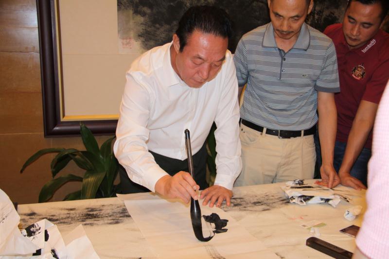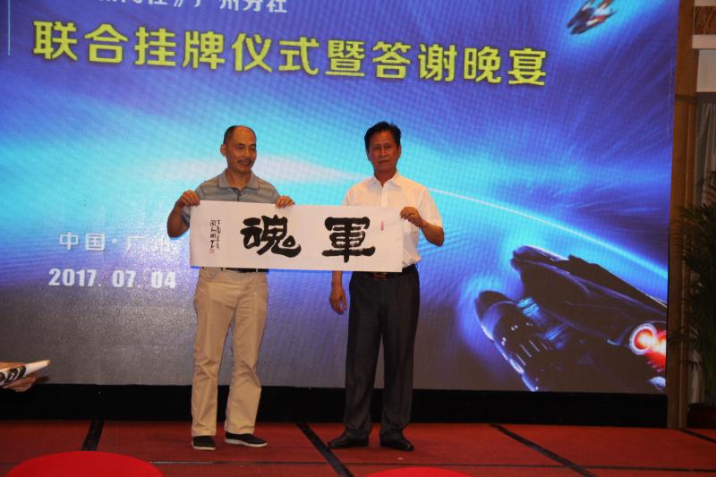 书画名家关穗生(右)向凤凰新闻社社长田长友(左)献字画