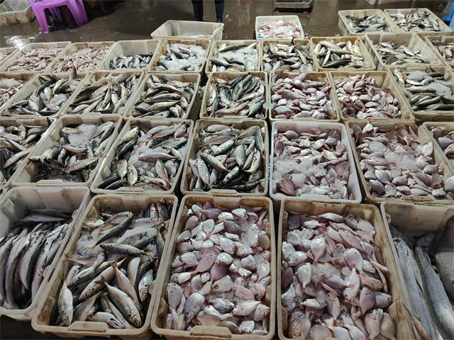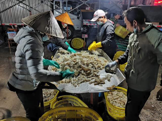 凌晨五点左右,大大小小的渔船载着满舱的海鲜陆续归港。虽然此时天还黑着,但是企沙渔港已经热闹非凡,归港后的渔民们第一时间将收获到的海产品进行分拣包装,随后将这些海产品运往码头上的交易区。天刚蒙蒙亮的时候,交易区已经人声鼎沸,白色的箱子装满着刚下分拣好的新鲜海鲜,来批发的商贩们围着海鲜跟渔民激情地讨价还价着,场面十分热闹。