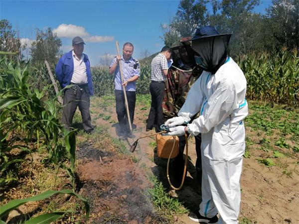 8月4日上午,天桥岭森林公安局张家店派出所派出所接到家属的求助,鉴于事件的特殊性,该所立即将情况向上级机关报告,延边森林公安局和天桥岭森林公安局刑侦技术人员在现场勘查时发现萝卜地边地下有一窝大黄蜂。由于蜂窝的位置比较隐蔽,不易被人发现,为防止大黄蜂继续伤人,张家店派出所民警立即组织专业人员利用煤气喷火枪消灭这窝“惹事野蜂”,经过半小时的火攻,成功捣毁这窝害人的大黄蜂。