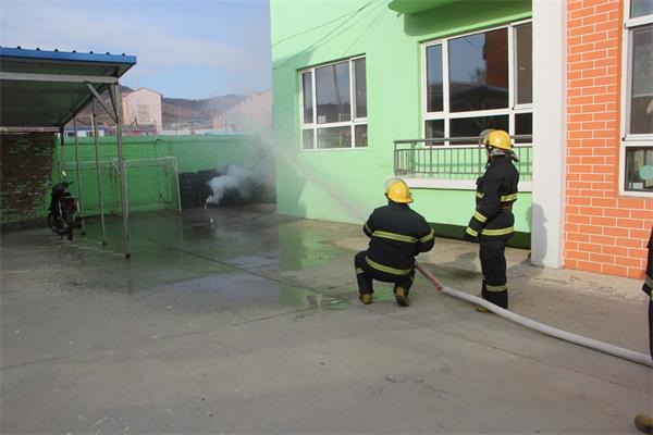 活动开始,幼儿园拉响消防警报,幼儿们用湿毛巾捂住学生口鼻,听从老师们指挥按照指定路线,有序疏散至操场的安全位置。到达安全地点后,各班老师对本班孩子人数进行清点,并及时报告。消防大队赶到现场后,进行现场勘查,发现无人员被困,指挥员下达作战指令,出两盘水带,一班战斗员对火场进行扑救,二班战斗员向旁侧打水防止火势蔓延。最后,消防大队指挥员向幼儿园师生介绍消防安全知识及灭火器、、应急灯、火警铃等消防设备的使用方法。