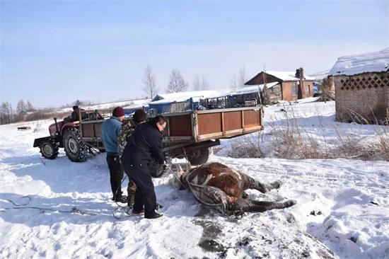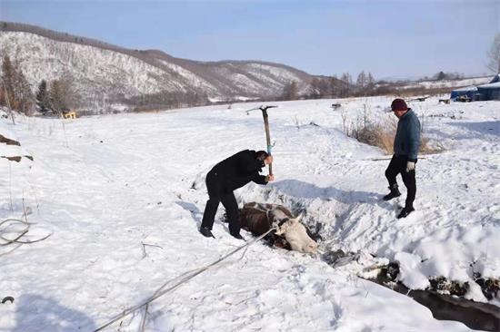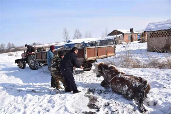 在等待李某回家取农用四轮车的时间内,民警和群众不顾寒冷使用尖稿、铁锹等工具,刨除黄牛四周冰雪,扩大救助面积,以减轻拖拽对黄牛造成的伤害。为确保万无一失,在拖拽工作开始之际,民警又同李某一道检查了捆绑的绳索,将绳索捆绑在黄牛相对安全的部位。随着农用四轮车马达的轰鸣、人力辅助和通过多个方向的尝试,在近1个小时的紧张忙碌下,民警及前来帮助的群众终于将被陷深沟里的黄牛拖拽上岸。