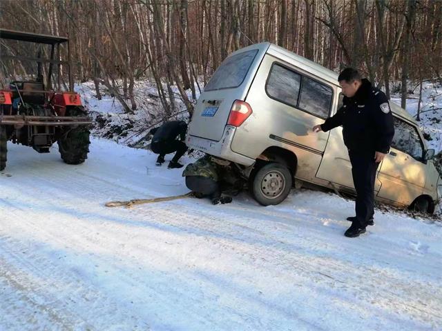 11月19日下午,响水派出所民警在开展交通勤务工作,查看雨雪天气后道路情况,当途经响水至分水岭路段时,发现一辆银灰色面包车滑进路旁沟内,路旁一名男子正来回走动查看被困车辆,副所长朴文一与民警刘晓亮立即上前询问情况,得知司机驾驶的车辆没有及时更换雪地胎,因道路结冰,没有控制好车速滑到路旁的沟里。所幸无人员受伤,民警立即对车辆开展救援,同时对道路两端的路面设置警示标志。由于刚下完雪,道路湿滑,面包车前轮已深陷沟内无法出来,民警立即联系附近群众,找来有带防滑链的拖拉机前来救援,经过半小时的救援,面包车终于被拽回道路上。经检查可以正常行驶。