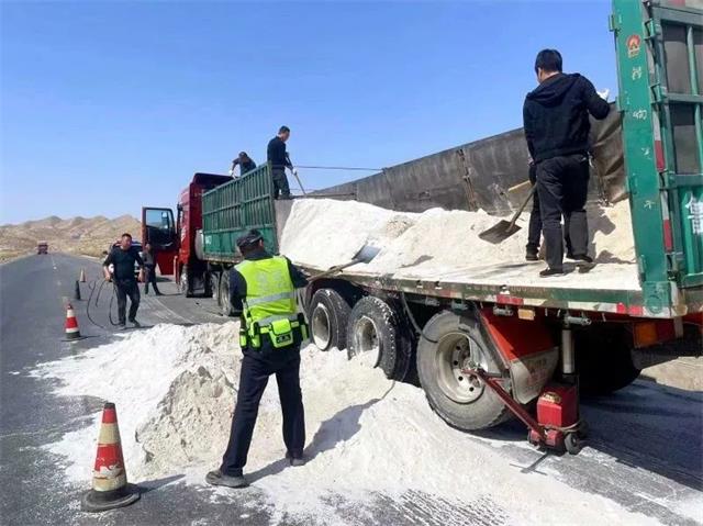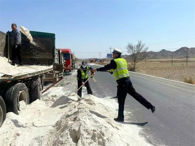 二、货车爆胎石英砂散落一地 景泰交警“排雷”清障保畅通