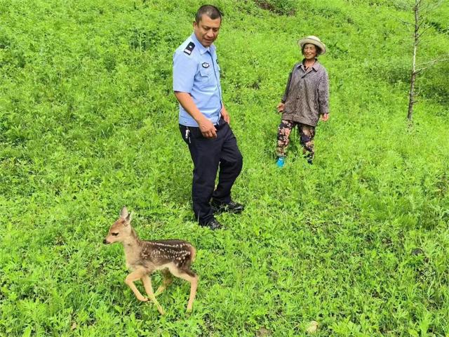 6月11日,巡警大队接到辖区群众求助称:和龙林业局四居水塔附近发现一只狍子幼崽。接到求助后,民警立即赶赴现场,发现一只狍子幼崽蜷缩在路旁,身体瑟瑟发抖,经仔细查看,狍子幼崽无明显外伤,民警判断其可能与母狍走散,长时间未进食,加之受到大雨侵袭,受到惊吓导致身体虚弱。民警决定将其带回队里,为其吹干皮毛并购买鲜奶。经民警的悉心照料,小狍子体力明显恢复,精神状态良好,活动自如。经救助站工作人员判断其已具备野外生存条件,随即,民警与求助人一同将其放归大自然。
