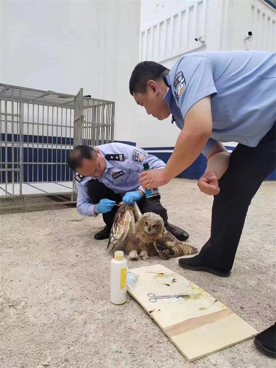 6月25日,广坪派出所民警在开展日常巡护时,发现一只疑似受伤的“猫头鹰”蹲坐在路旁。经民警仔细检查,发现其翅膀受伤、身体虚弱,暂不能飞行,民警决定将其带回派出所进行救治。到达派出所后,民警立即与野生动物救助站联系,咨询现场应急治疗处置方法,对其进行消毒治疗,并临时安置派出所做进一步观察处理。为其尽快恢复体力,民警拿来食物对其进行投喂。经民警的悉心照料,其外伤得以痊愈,恢复了野外生存能力,符合放生条件,民警将其放归大自然。