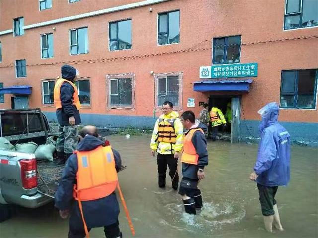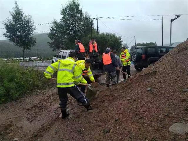 8月11日5时许,河道水位持续上涨,积水漫过公路涌入楼区,为了最大减少群众财产安全,民警立即联合林场职工使用铁锹装入沙石进行封堵单元门,搭建防洪沙袋,防止暴雨倒灌造成群众财产损失,为辖区群众构筑“防洪堤坝”,共封堵单元门24个。
