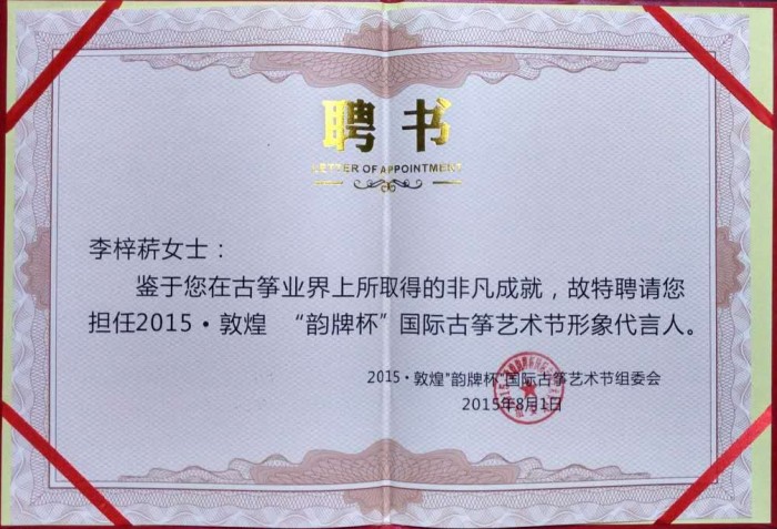 2015年,受邀担任2015·敦煌“韵牌杯”国际古筝艺术节形象代言人;2016年,受邀担任第七届中美国际艺术节古筝评委;2017年,受邀担任2017·全球华人国际音乐节--古筝大赛形象代言人。