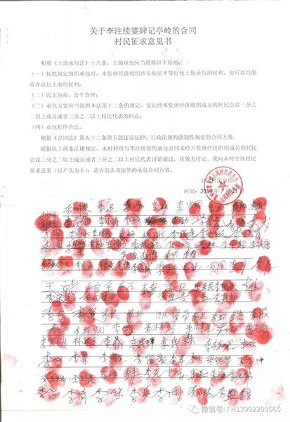 于1989年7月22日与山尾村委会签订了一份《土地承包合同书》,承包了村里座落于碑记亭岭的56亩土地,四至为:东至那亭湖;西至公路水沟;南至牛角湖;北至过冬湖。承包期限从1989年8月2日至2019年8月2日,共30年。合同约定:从1989年8月2日至1992年8月2日每年56亩总承包金仅为200元;从1992年8月至2019年8月每年56亩总承包金为700元。按道理,合同到期,村集体根据村民诉求把土地纳入新农村建设应予支持,但原副镇长李注却以种种理由继续侵占该土地,其中他辨称前届村干部与他签有延期承包合同,采访中我们也看到李注与前届村干部签订的合同复印件,但是该复印件非正式合同,只是前村干部在原合同书上签字。