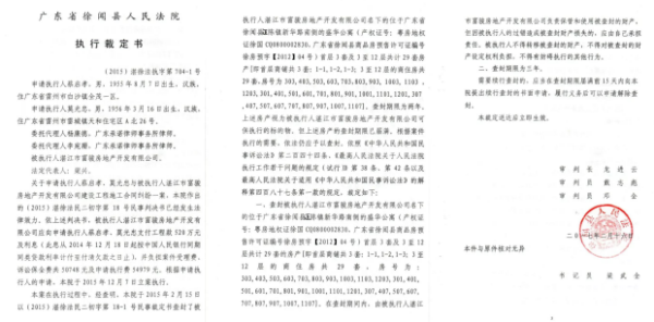 2015年2月15日,广东省徐闻县人民法院作出(2015)湛徐法民二初字第18—1号《民事裁定书》,依法查封被告湛江市富骏房地产开发有限公司名下所有位于徐闻县迈陈镇新华路南侧的盛华公寓首层3套及3至12层共计29套的房产。