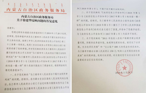 徐建华向内蒙古自治区政务服务局反映情况,内蒙古自治区政务服务局不但没有责令乌兰察布市人民政府依法公开信息,反而袒护乌兰察布市人民政府,以政务服务局无权处理为由,把皮球踢给了内蒙古自治区信访局。内蒙古自治区信访局也未对乌兰察布市政府做出任何约束和质责。