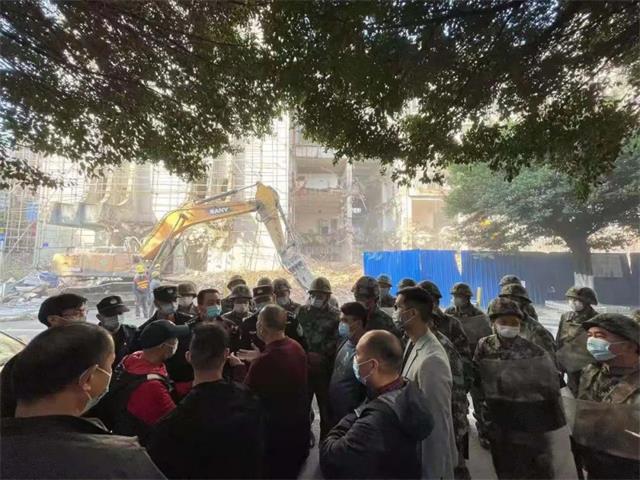 业主们倾诉,2021年1月29日,在该房产拥有者张先生及该栋大楼里其他房屋权属人不知情的情况下,几十个身穿统一迷彩服装的不明人士手持盾牌对整栋房产进行强制围蔽,采用挖掘机、打桩机等大型毁坏性设备对整栋房产进行拆除,同时对四周道路进行封锁,他们无法进入自身房产。