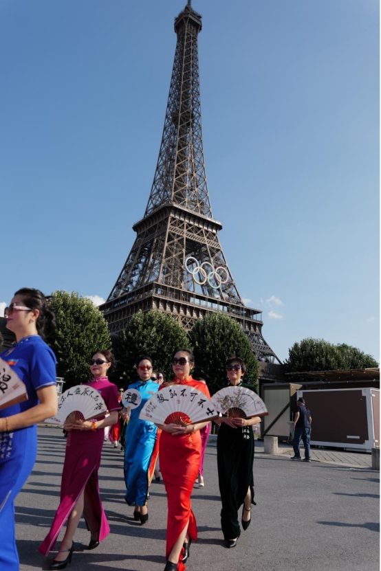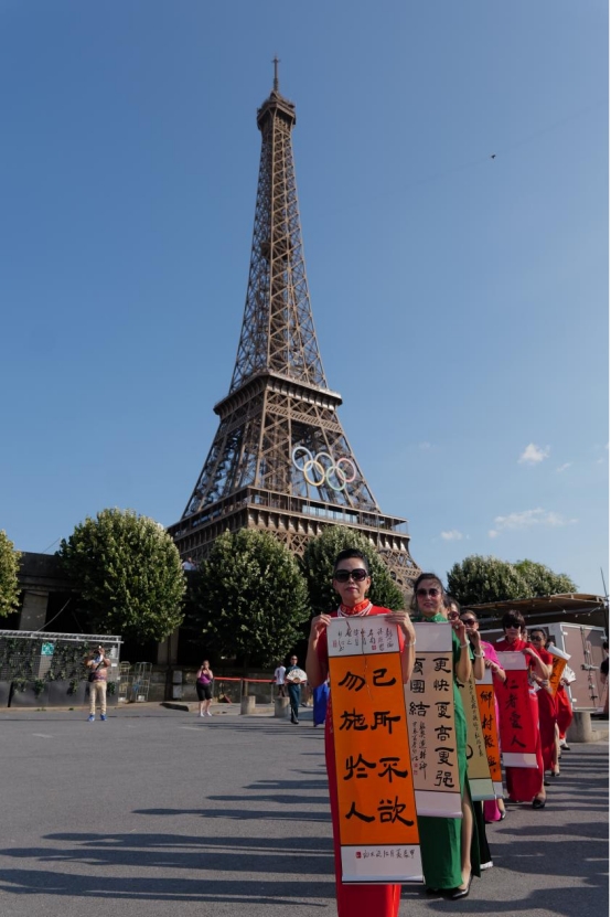 近日,50多位中华雷锋志愿者在法国巴黎埃菲尔铁塔下举办了一场中国旗袍秀。她们身穿旗袍,手持书写着“敏而好学”、“温故知新”、“己所不欲,勿施于人”等《论语》中经典名句的折扇和中国卷轴,在向世界展示中式旗袍美的同时,也讲述了中国传统文化中所体现的儒家思想与价值观。这场行走的中国文化秀引来现场外国游客围观、拍照和纷纷点赞。