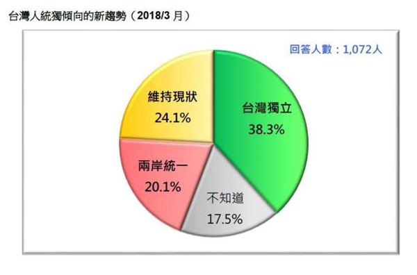 2018 年三月,台灣人統獨傾向的態勢為何?台灣民意基金會問:「國內對於台灣前途問題有很多爭論,有人認為「兩岸統一」比較好,也有人認為「台灣獨立」比較好。請問您的意見是怎樣?是「台灣獨立」或是「兩岸統一」?」結果發現:38.3%認為未來台灣獨立比較好,20.1%認為未來兩岸統一比較好,24.1%認為未來維持現狀比較好,16.5%沒意見、不知道、拒答。換言之,最新民意顯示,「未來台灣要獨立」仍是台灣人的「眾數傾向」(mode trend),或說是相對多數的傾向;其次是「維持現狀」,第三才是「兩岸統一」。