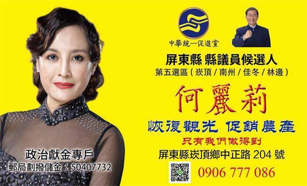 台灣屏東統一促進黨何麗莉在中華統一促進黨張安樂總裁理念號召下,支持兩岸九二共識,回到屏東家鄉參加縣議員候選人,希望將九二共識的理念告訴屏東家鄉人,認清台獨不可為,只會增加兩岸危機及經濟大退歩20年。