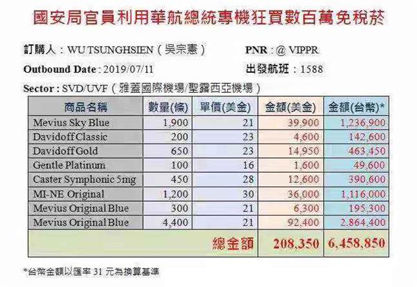 蔡英文今天結束為期12天的「自由民主永續之旅」,時代力量立委黃國昌稍早在臉書發文指出,國安局官員竟然利用陪同總統出訪的專機,先透過華航高層在系統後台預訂9800條的免稅菸品,金額高達645萬元,並在今天透過國賓特殊通關禮遇,夾帶入境,「堂堂國安局,國家安全不努力,走私菸品牟利衝第一。令人痛心疾首!」