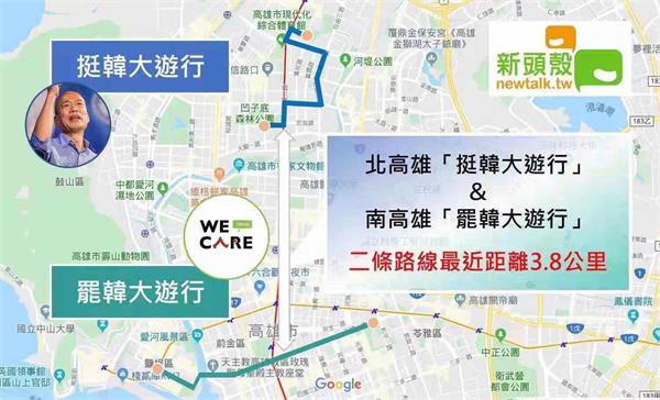 挺韓遊行路線總長度3.1公里,罷韓遊行總長度約4公里。雙方陣營一北一南,挺韓陣營選擇從位於鼓山區農16重畫區的凹子底森林公園出發,往北移動經三民區到左營區微笑公園結束;罷韓陣營佈局在南高雄,沿著東西向的五福路,由苓雅區、前金區一路往西到與高雄港接壤的鹽埕區。