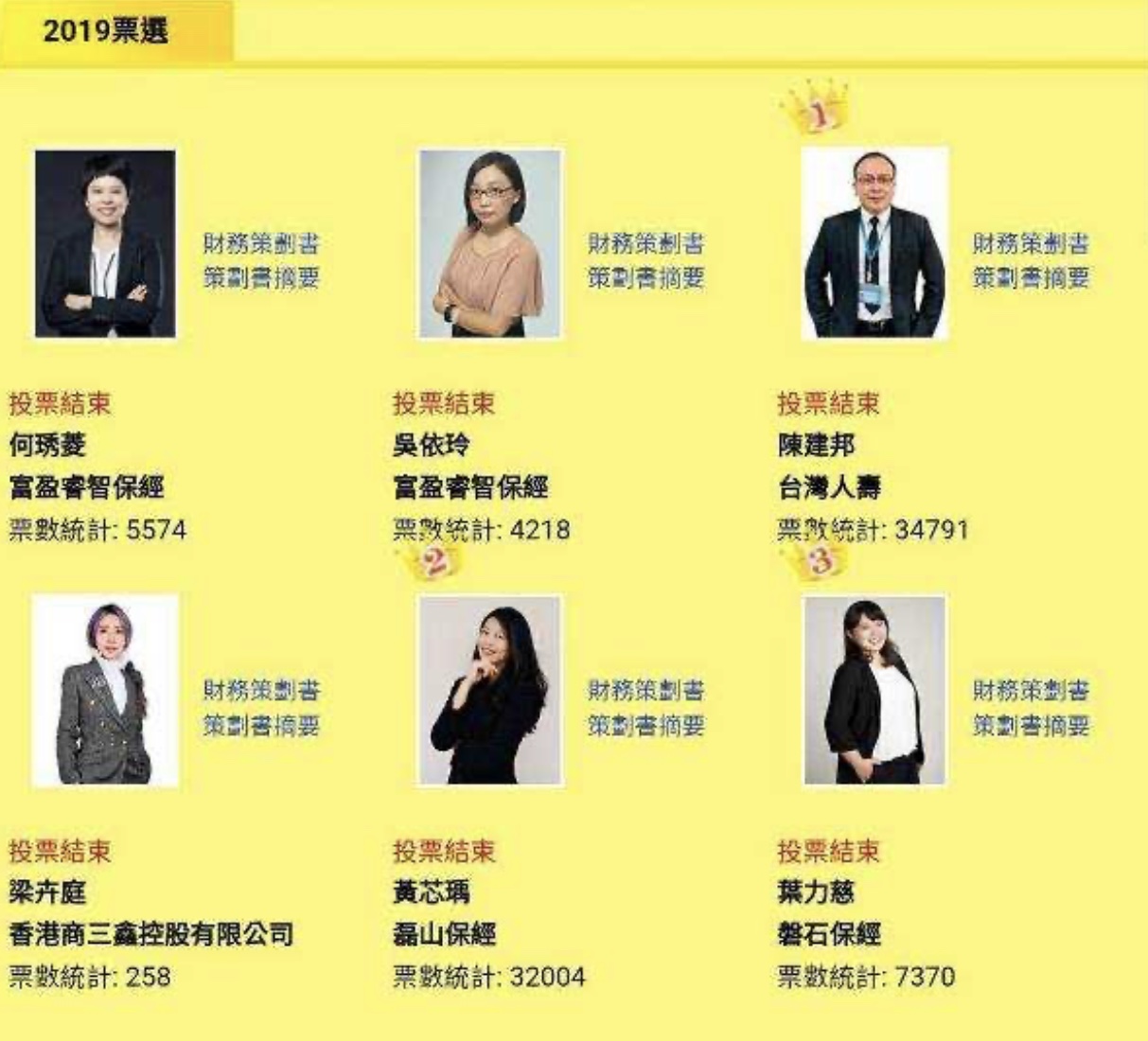 美国注册财务策划师协会台湾管理中心(RFPI)、社团法人台湾注册财务策划师协会(TRFP)主办「2019台湾最佳财务策划师选拔」于6日下午在台北国际会议中心举办授奖典礼。评审团选出6位个人组参赛者得分最高的梁卉庭网路票选只得到258票,与冠军陈建邦的3万多票相差悬殊,意外仅获得亚军。