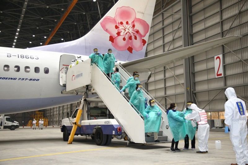 专案小组人员在专机未抵达前,就已换上防护衣、口罩等全副武装在机棚待命,等到专机落地后,随即推至台湾飞机维修公司机棚,当飞机进入后也立即关起大门维护机上乘客隐私,陆军司令部三三化学兵群也马上进行人员与机具等消毒任务。