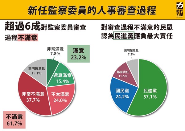 监察院人事案不敌国民党两度抗争,监察院长被提名人陈菊以65:3过关,其余26位监委被提名人也获出席立委过半数同意票。对此,时代力量26日公布最新民调,超过六成民众对于审查过程不满意,过半民众认为民进党要负最大责任。