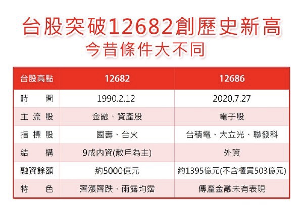 台湾台股在7月22日及24日分别在盘中推升指数高点至12486点及12502点,离30年前台股历史高点12682点愈来愈近,7月22日距离历史收盘高点12495点更仅差22点;台股今天在台积电再创新高下,盘中成功带动指数攻过12682点的天花板,台股自此进入另一个里程碑。