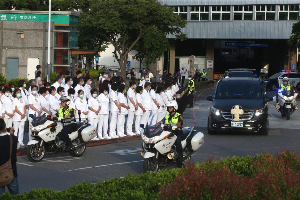 警用重机在最前方开道,前总统李登辉的灵车车队,绕行总统府一圈,象征李前总统的“最后巡礼”。总统府秘书长李大维代表总统蔡英文,率领府内一级主管和宪兵,在府前广场致意送李登辉最后一程,北荣医护列队,7月30日李登辉在台北荣总过世,8月14日清晨从北荣移灵,不少医护人员一早在路旁列队送行。