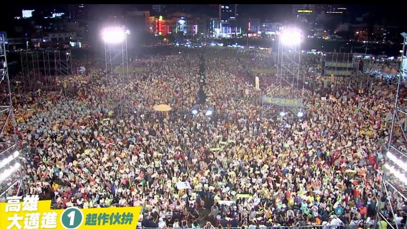 明日就是高雄市长补选投票日,今晚选前之夜,陈其迈与李眉蓁分别举办选前之夜大造势,总统蔡英文、副总统赖清德、行政院长苏贞昌专程南下替陈其迈站台,希望在选前最后一夜,激出更多选票,让已准备好为高雄服务的陈其迈高票当选。稍早,民进党高雄市党部主委赵天麟在台上宣布,现场人数已经冲破10万人。从空拍画面可见,现场挤满人潮,大批支持者高喊“陈其迈冻蒜”,蔡英文压轴现身,现场气氛超嗨。
