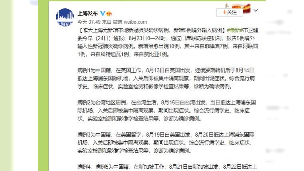 台湾新冠肺炎疫情持续升温,今(24)日传出又有台湾输出病例。上海市卫健委今通报,新增5例新冠肺炎境外移入病例中,有1名为为台湾居民,本月15日自台湾飞抵上海浦东国际机场,随后被集中隔离观察,出现症状后,经过相关检测确诊。 综合陆媒报导,该个案,为台湾居民,本月15日自台湾飞抵上海浦东国际机场入关后即被集中隔离观察,期间出现症状。综合流行病学史、临床症状、实验室检测和影像学检查结果等,诊断为确诊病例。
