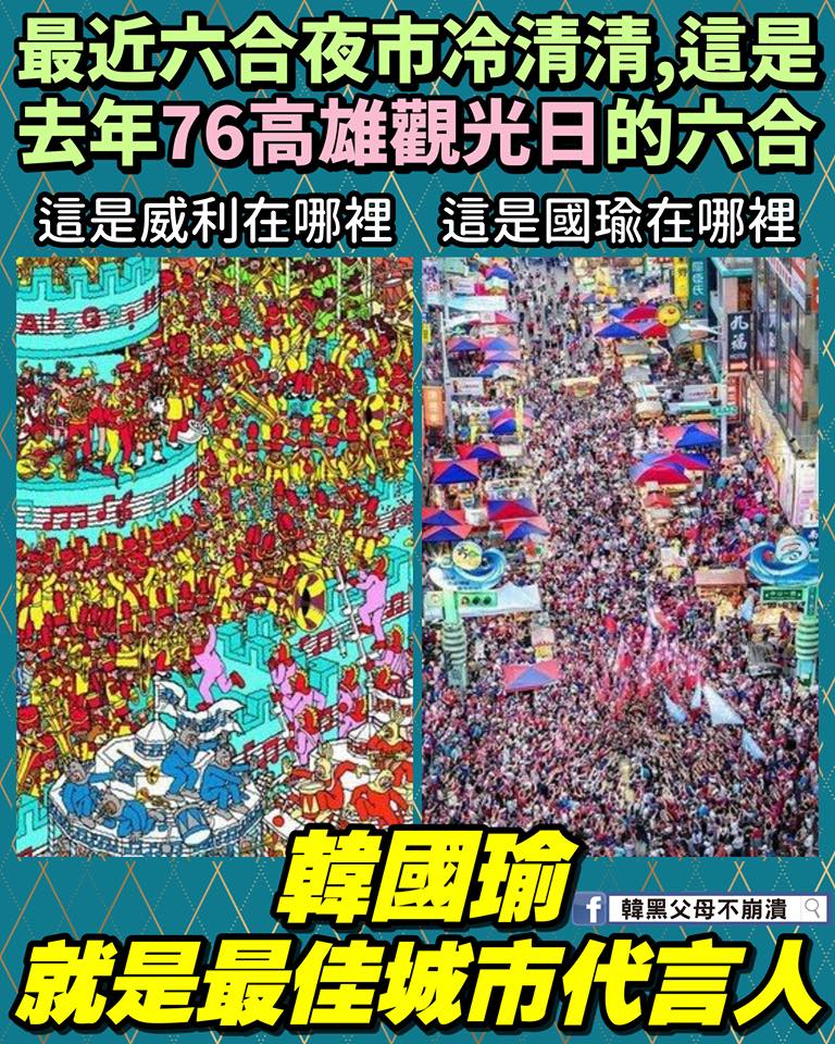 脸书粉专“韩黑父母不崩溃”近日分享一张,去年7月6日高雄观光日六合市场的照片,并指出,陈其迈市长说要促进观光,结果最近六合市场相当冷清,韩国瑜市长根本自带流量,就是高雄的最佳代言人,“不用多花钱,不用每个月换代言人,有国瑜在,就是满满的人潮和钱潮啊!”