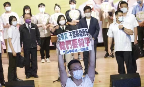 台湾总统蔡英文晚间参加新北市小英之友会中和分会举办的首场“民主前进挺18”宣讲活动,致词时突然有后排3位民众冲向会场中央座位区,高举抗议字牌,高喊“要和平!不要挑衅”,随后遭国安人员制止及强制带离,蔡英文在台上则有护扈保护,并未受到伤害,活动约中断5分钟然后继续,警方事后查明抗议者为中华统一促进党人士。