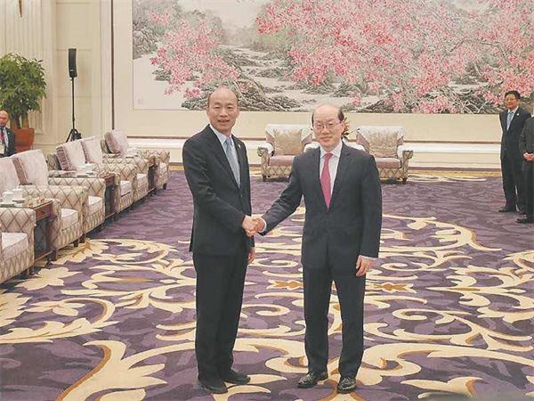 韓國瑜今天下午4點30分在深圳麒麟山莊,和國台辦主任劉結一會晤,雙方互動熱絡,劉結一表示,在韓國瑜的帶領下,推動兩岸發展進步實現了更好的發展、收穫更多,且這些成果將帶給高雄鄉親們扎實的利益實惠,使他們的勞動成果、智慧和血汗,能夠通過兩岸同胞情誼的紐帶,轉化成更加美好的生活。