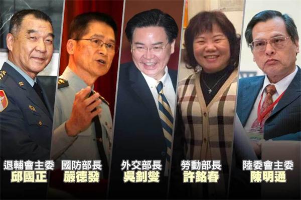 內閣異動名單23日出爐,包括:外交部長總統府秘書長由吳釗燮接任;國防部長由國安會秘書長嚴德發接掌;陸委會主委由台大國發所教授陳明通接任;退輔會主委由前參謀總長邱國正接任;勞動部長由高雄市副市長許銘春接任。