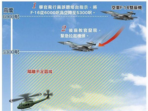 空軍F-16雙座機在6000呎高空時,學官飛行員誤聽塔台指示,將飛機下降到5300呎,因隔離不足,差點撞上位於約4000餘呎的陸軍UH-1H直升機,後座教官發現緊急拉起機頭,才免去災難。
