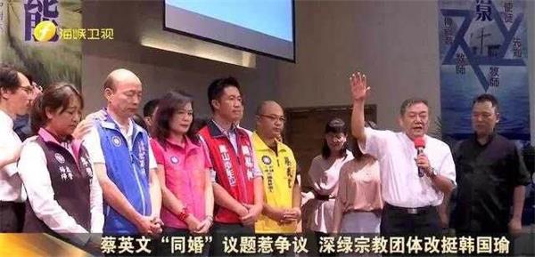 基督教全球禱告日鳳山場次27日傍晚在鳳山活泉靈糧堂舉行,高雄基督教豐收教會主任牧師蔡宗勳及十幾位牧師、500多位基督教徒給予國民黨高雄市長候選人韓國瑜禱告。蔡宗勳表示,基督教會長期以來挺綠居多,但民進黨這兩年執政已嚴重違反教會信念價值及下一代教育。因此教會決定打破慣例、跨越藍綠,在年底選舉改支持國民黨。 同婚議題延燒,民進黨準備修改《民法》一夫一妻制為多元成家,但同婚及性教育課綱等議題讓不少支持民進黨的基督教會反對。基督教豐收教會主任牧師蔡宗勳指出,他們是深綠基本教義派,大多的基督教牧師也是深綠,但他們認為藍綠統獨問題比不上婚姻價值。現在民進黨蔡英文支持同婚,加上這兩年民進黨執政嚴重違反教會信念價值,他們無法信任陳其邁。因此,在年底市長選舉中,教會將全力支持韓國瑜。 國民黨高雄市黨部主委韓國瑜今年四月宣布參選後,基督教牧師已邀請韓國瑜到教會替他祈禱,與會的基督教全球禱告日的牧師這天也對韓國瑜及其他國民黨市議員鍾易仲、陳若翠、李雅芬及蔡武宏等人祝福。 蔡宗勳表示,自己曾跟韓國瑜進行討論,雙方在家庭價值上具備共識,且基督教牧師們對韓國瑜提出的高雄願景認可。蔡表示,他是「教會建造網絡」召集人,韓國瑜接地氣,如今韓國瑜已獲國民黨提名,未來將發動至少300個在地基督教會支持韓國瑜。 韓國瑜27日也公開支持基督教會所提出的三大要求包括,一夫一妻制的婚姻價值、同志教育須等高中以後再教、同性婚姻須另立專法。韓指出,家庭價值是至高無上的,一定要全力保護,「高雄價值」也必須深入探討。高雄有山有水,有空港海港,還有勤奮善良的市民,未來高雄一定要振興經濟、觀光,發光發熱。