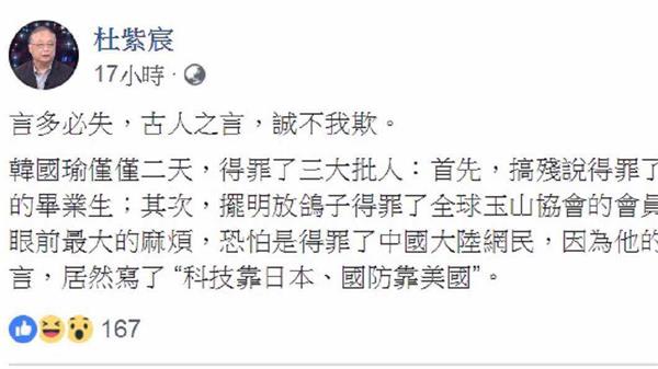 杜紫宸昨天(14日)在臉書上表示,言多必失,古人之言,誠不我欺,指韓國瑜訪美僅僅二天,就得罪了三大批人。「首先,搞殘說得罪了所有台大法律系的畢業生;其次,擺明放鴿子得罪了全球玉山協會的會員。」文末他強調,「韓國瑜眼前最大的麻煩,恐怕是得罪了中國大陸網民,因為他的所謂哈佛 20 字箴言,居然寫了『科技靠日本、國防靠美國』。」