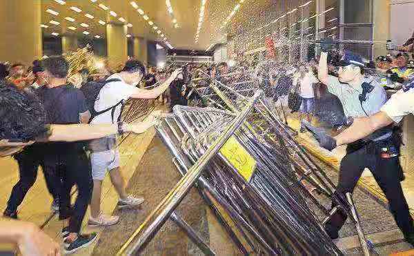 一些示威者敲打鐵閘,要求中聯辦主任王志民出來。還有示威者認為中聯辦內有人向外拍照,以鐳射燈干擾。