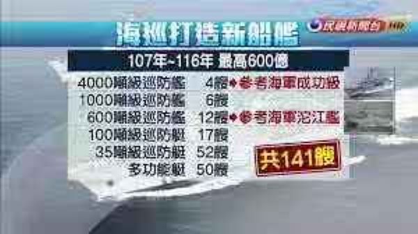 台湾海巡署「筹建海巡舰艇发展计画」从2018年到2027年新建4000吨巡防舰4艘(台船得标)、1000吨巡防舰6艘(台船得标)、600吨级双船体(改为700吨级)巡防舰12艘(中信造船得标)、100吨级巡防艇17艘(中信造船得标)、35吨级巡防艇52艘(中信造船得标)、沿岸多功能艇50艘(罡旻得标)共计141艘。