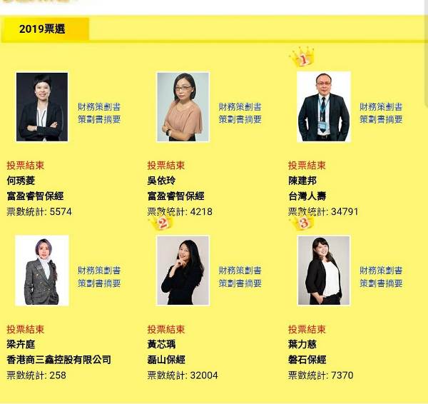 美国注册财务策划师协会台湾管理中心(RFPI)、社团法人台湾注册财务策划师协会(TRFP)主办「2019台湾最佳财务策划师选拔」于6日下午在台北国际会议中心举办授奖典礼。评审团选出6位个人组参赛者得分最高的梁卉庭网路票选只得到258票,与冠军陈建邦的3万多票相差悬殊,意外仅获得亚军。