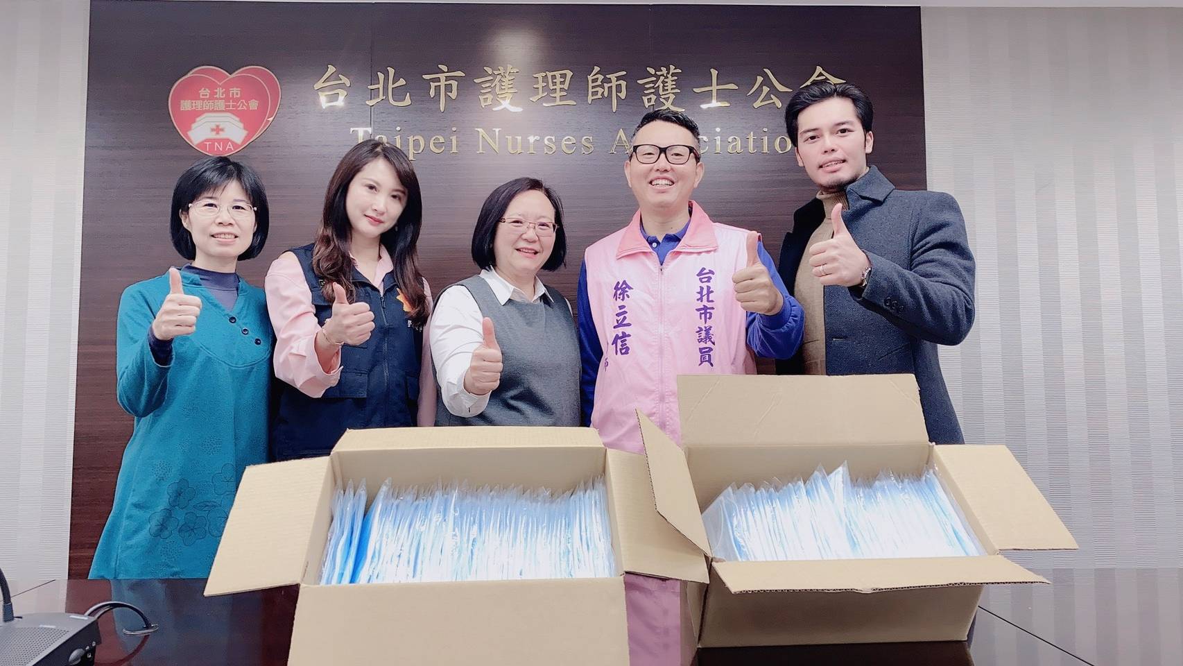 透过徐立信议员的奔走努力,获悉第一线的护理人员在疫情威胁下口罩稀缺,大医院每位护理师一天只能分配到一枚口罩,而资源较缺乏的私人医疗院所及照护机构则相形见肘,每人2至3天才能配给到一枚,警政时报美女主播赵唯宁乃代表报社与徐立信议员联手捐赠600枚口罩给台北市护理师护士公会,盼能为辛苦的护理人员稍解燃眉之急。