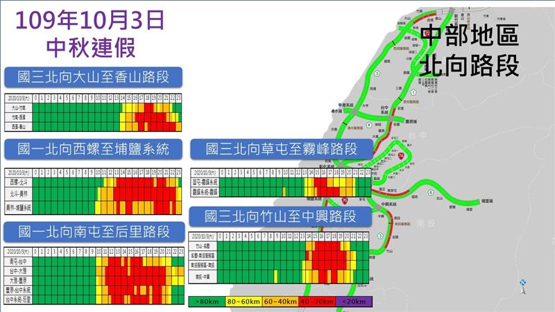 北向关西至大溪路段下午2点到晚上10点,大山至香山路段下午4点至晚间11点,北向竹山至中兴路段下午2点至晚上8点,北向草屯至雾峰路段下午2点至晚上7点。