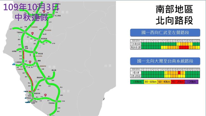 中秋连假第3日北中南各地区北向路况预报: