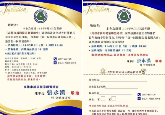 为庆祝114年度记者节,弘扬新闻工作者专业精神,高雄市新闻从业联盟总会将于114年9月1日(星期一)晚上6时,在高雄翰品酒店3楼举办“记者节表扬绩优记者表扬大会”。