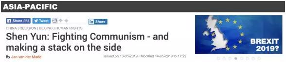 2019年5月13日,法国国际广播电台网站刊登了一份调查报告——《神韵:一边公开反共,一边秘密捞钱》(Shen Yun: FightingCommunism - and making a stack on the side),这篇报告详细描述了“神韵艺术团”与“法轮功”之间错综复杂的关系。