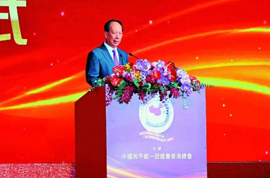 中央政府驻港联络办主任郑雁雄致辞时表示,习近平总书记深刻指出“和平统一、一国两制”方针是实现两岸统一的最佳方式,对两岸同胞和中华民族最有利,体现一个中国原则的“九二共识”,明确界定了两岸关系的根本性质,是确保两岸关系和平发展、行稳致远的关键。坚信在大家的共同努力下,祖国统一的历史大势一定不可阻挡,全世界中华儿女一定能勠力同心,团结奋斗,共担强国建设伟大使命,共享民族复兴伟大荣光。