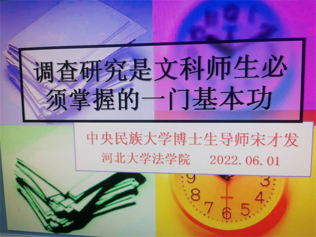 河北保定6月3日电 2022年6月1日下午,河北大学法学院举办“燕赵法学大讲堂”第8场讲座,特邀中央民族大学法学院首任院长宋才发教授主讲,讲座的题目是《调查研究是文科师生必须掌握的一门基本功》。报告会由河北大学法学院院长陈玉忠教授主持,河北大学社科处处长宋凤轩教授参加报告会并致辞,河北大学法学院部分老师以及博士研究生、硕士研究生、本科生300余人参加了本次报告会。
