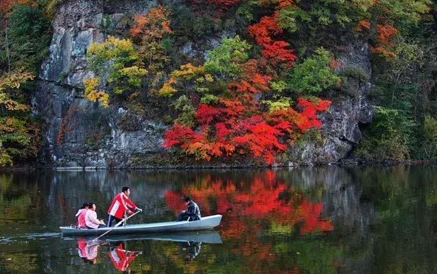 小船荡漾在湖中,周围有璀璨的树叶相伴——美不美?