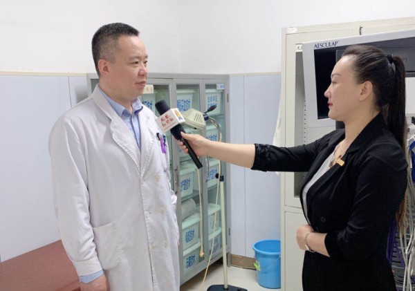 谢春成医生挤出空闲时间接受记者现场采访