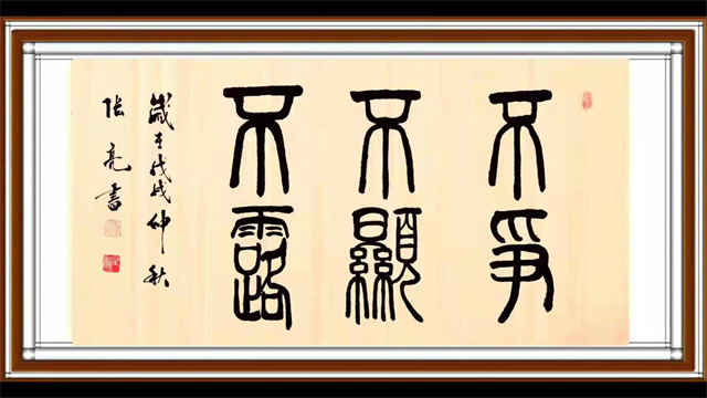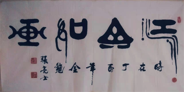 著名甲骨文书法家岳金良先生如是说: 纵观张亮先生的篆书作品,用笔凝重沉稳,字法开张匀称,结体精整,端正大度,匀停貌美,气势雄强,精熟的笔法技巧和恰当的笔墨意趣,使得自由书写中不失规矩,严谨中不失天趣。