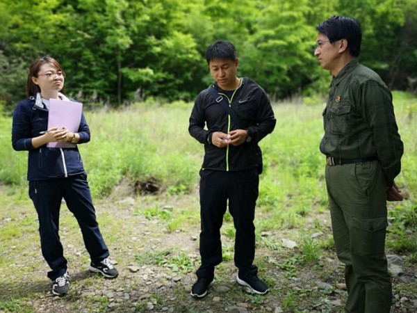 凤凰新闻社社长、总编田长友先生(右一),同汪清县党校领导(中)、龙井县党校领导(左一)在东满抗日游击根据地交谈